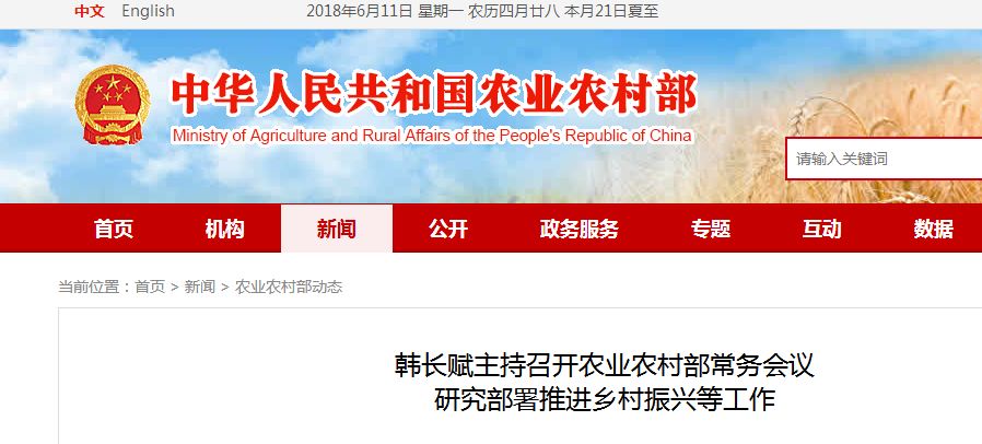 6月8日,农业农村部部长韩长赋主持召开部常务会议,传达学习中央有关会议精神,研究部署乡村振兴和品牌强农等工作。